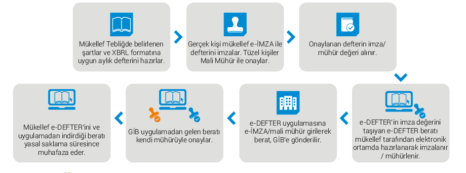Temel mantık şudur: Önce muhasebe kayıtları ile defterler oluşturulur, ardından bu kayıtlar elektronik defter formatına dönüştürülür, imzalanır ve beratları GİB sistemine yüklenir.
