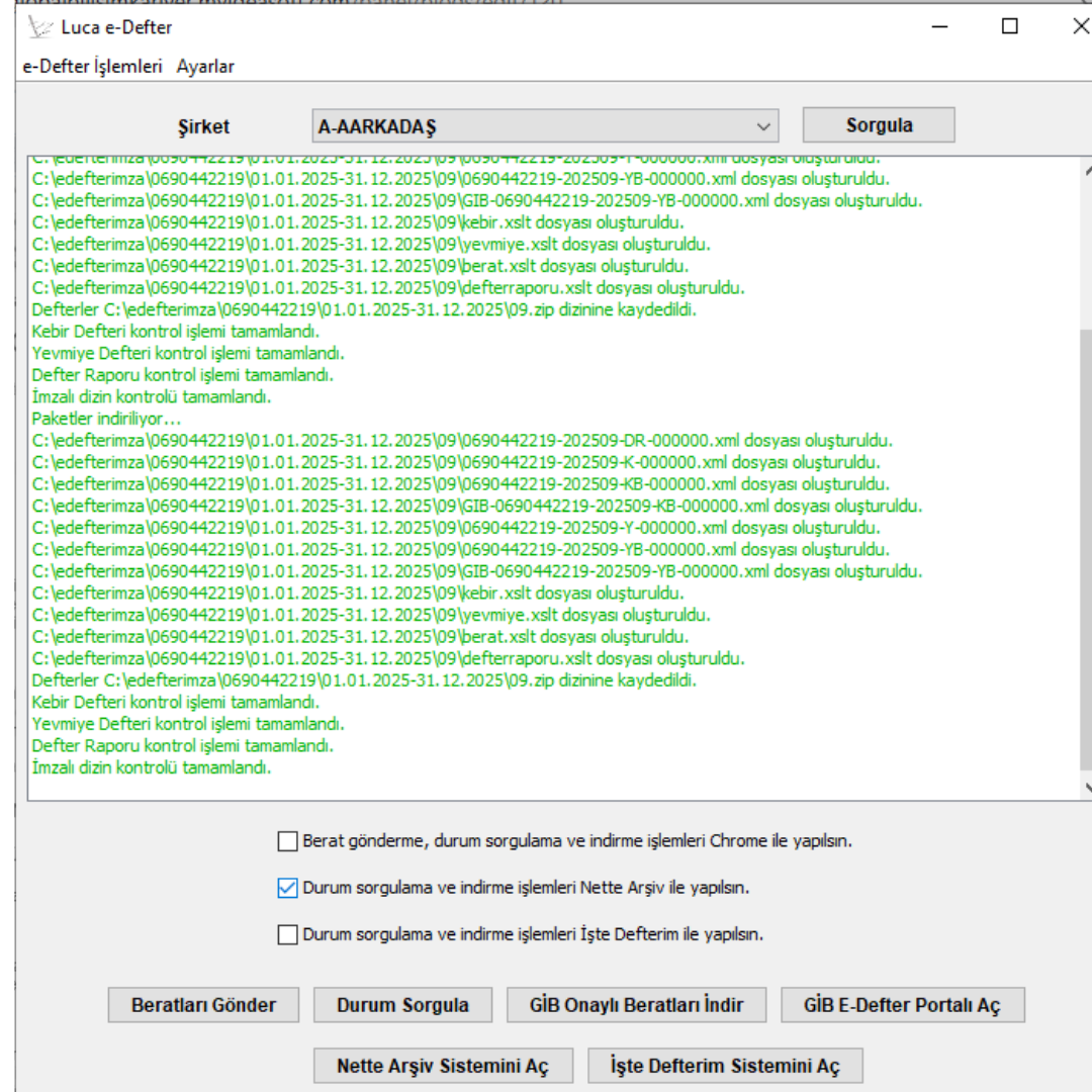 - Sistem defter dosyalarını imzalar ve imzalı paket oluşturur.